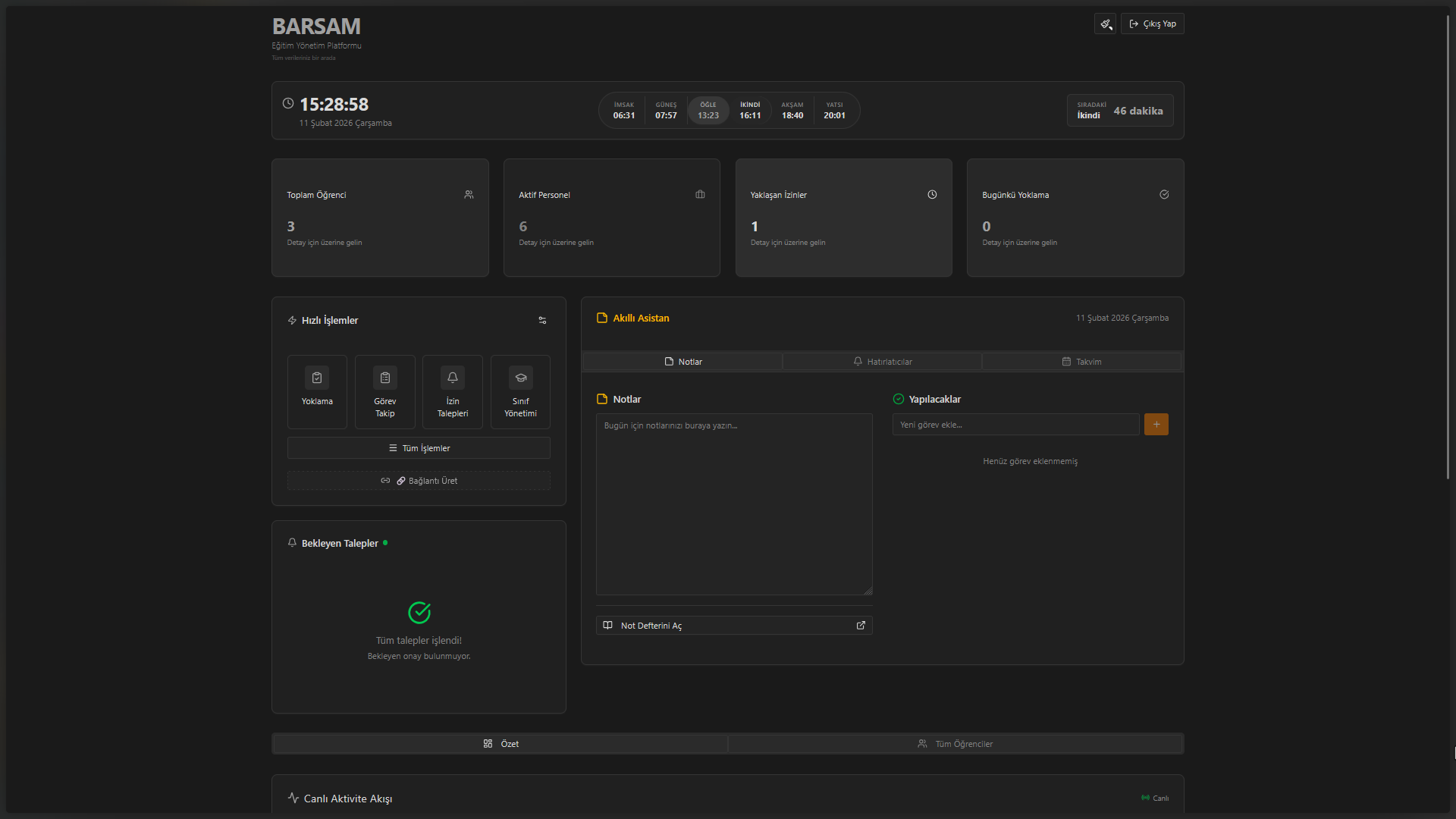 Lise & Kolej Yönetim Paneli — Gerçek zamanlı öğrenci, personel ve yoklama verileri