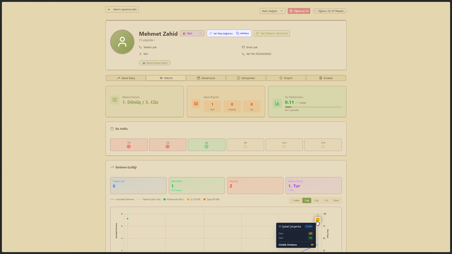 Sistem, öğrencinin ezber grafiğini analiz eder ve performans düşüşlerini önceden haber verir.